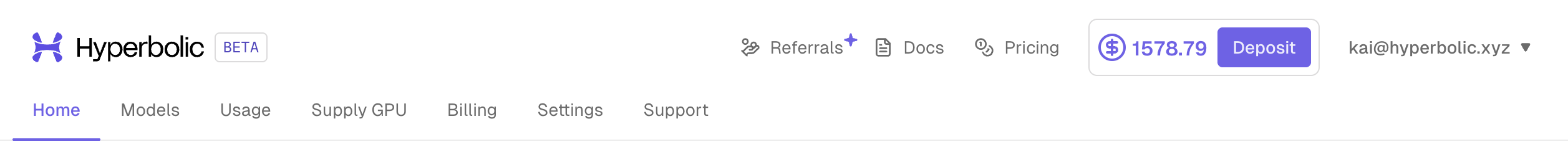 Hyperbolic's referral system allows you to invite friends and colleagues to the platform and earn rewards when they join. This feature is designed to help spread the word about Hyperbolic while rewarding both you and the people you refer.